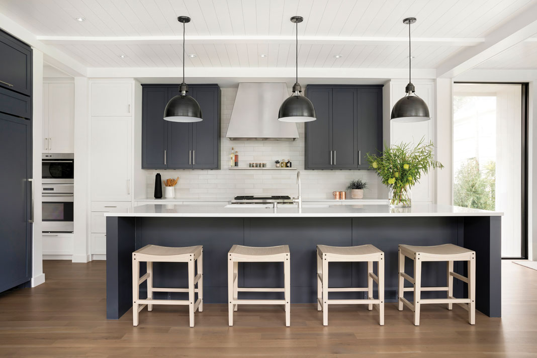 Note the two gabled pavilions with a steep roofline, and dormers and vertical nickel gap siding and metal panels: they’re linked by a glass-walled living room behind the traditional, columned front porch. Then enter spacious interiors in a minimalist white, black, and blue-gray color palette, with elegant finishes including white oak flooring, Baltic bluestone and blackened-steel fireplaces, and Paragon Aurea quartz countertops. The 5,518-square-foot house blends traditional cottage vernacular with an open modern aesthetic for a truly striking result.