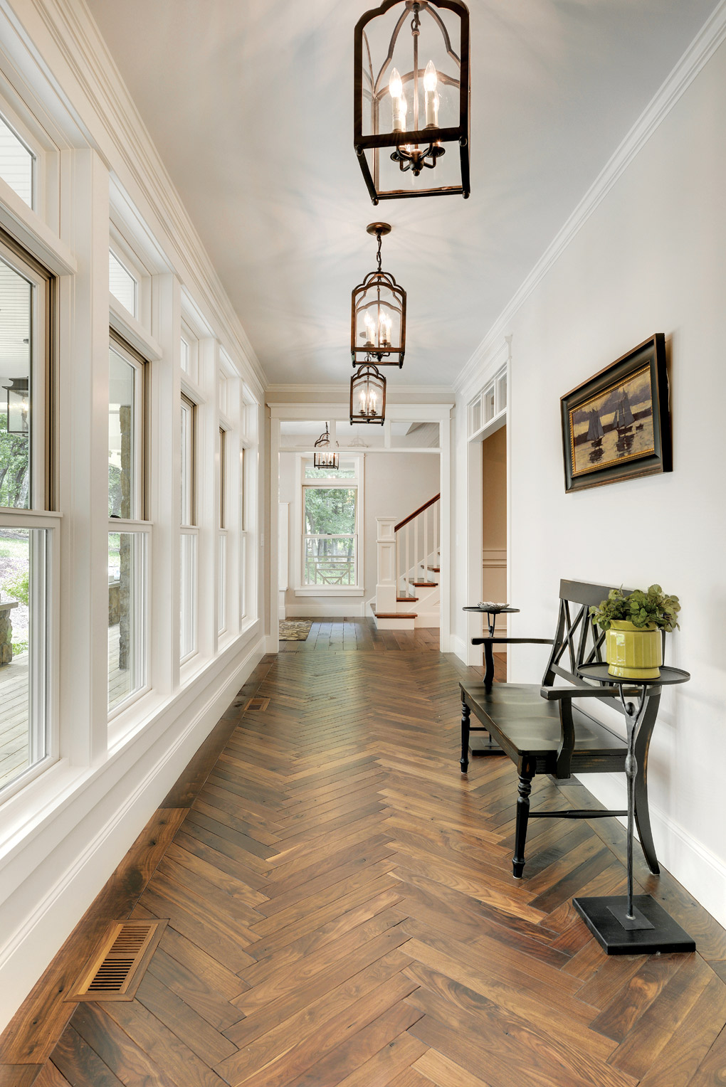 Although most home designs currently favor open floor plans, this house features the coziness of more defined rooms. The living room nestles around a two-sided stone-enclosed fireplace, its unfinished gray ceiling beams reclaimed from a farm near Northfield. On the far wall, a bank of windows overlooks the nearby Troy Burne Golf Course. Every feature in the house was chosen to echo the mood of an earlier era, including the wainscoting, period fixtures, double-hung exterior windows, swinging doors, and transoms above every interior doorway.