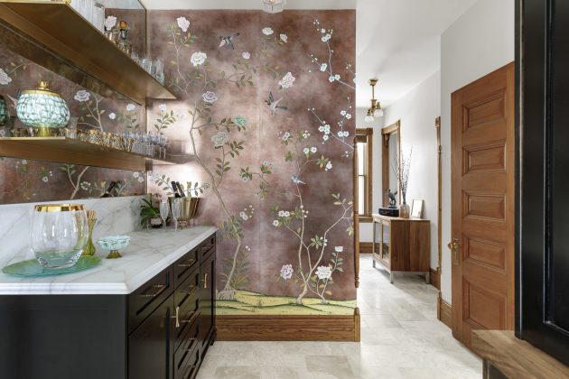 Within a St. Paul Victorian home, an elegant dry bar seamlessly connects the dining room and kitchen. Vintage lighting, a mirrored backsplash, de Gournay mural, and Lincoln marble countertop contribute to the layered look, while black-stained ash cabinetry and brass accents speak to the homeowners’ elevated taste.