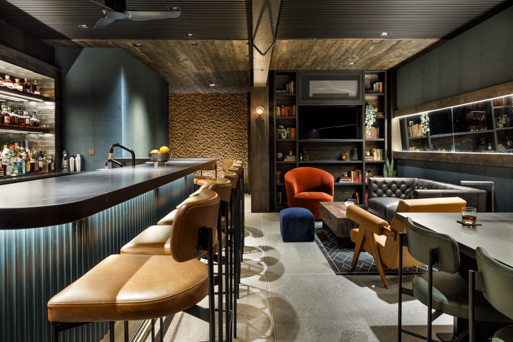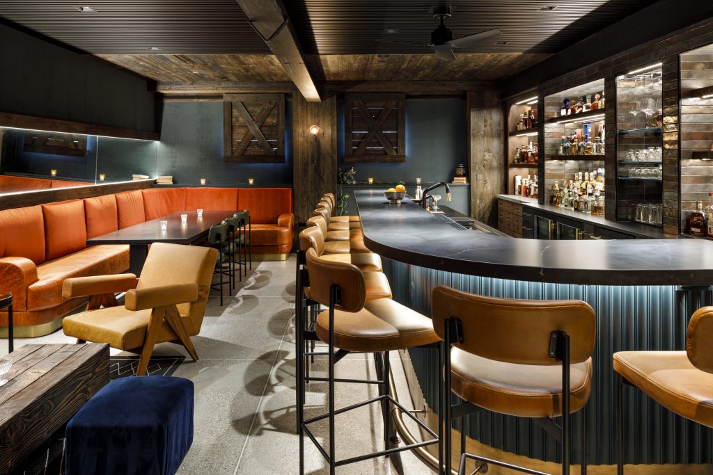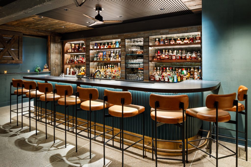 Beneath a multifamily Minnetonka Beach retreat lies a speakeasy-style bar hidden behind a secret door. Moody lighting, detailed millwork, and an eight-seat bar set the stage for intimate gatherings—balancing vintage charm with modern comforts, including a large flat-screen and plush booth seating.