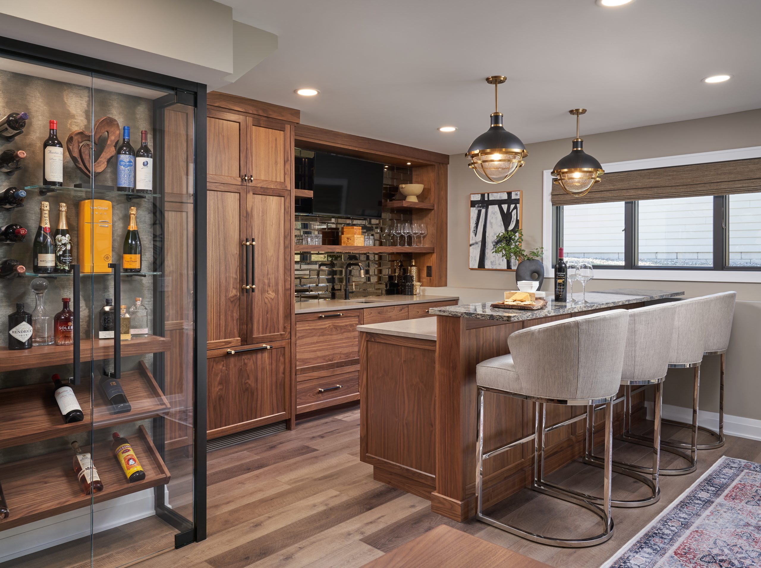 This walk-out basement bar in Eden Prairie was designed with moody elegance and multipurpose function in mind. From heated floors to temperature-controlled wine storage, every inch is crafted for an upscale entertaining experience. Natural stone, soft textures, and custom finishes enhance the classy feel.