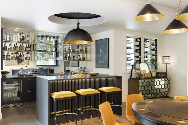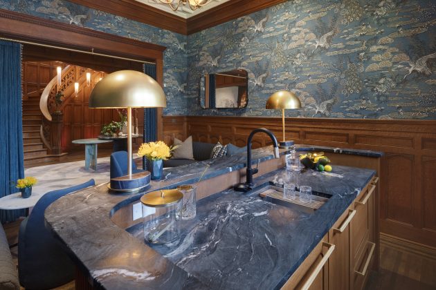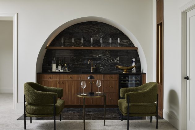 In a 1903 Minneapolis Tudor, this modern-meets-historic bar and lounge embraces bold wallpaper, reeded detailing, and floating elements to preserve the home’s structure. Custom windows and cantilevered bar shelving, paired with luxe lighting and plush seating, create a unique, memorable space designed for lively hosting.