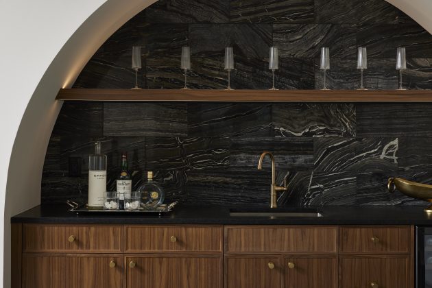 In this 1920s Greenfield farmhouse, a thoughtful remodel introduced a hidden gem: a stylish new bar tucked behind a glass pocket door just off the kitchen. Designed as part of a larger scullery expansion, the bar offers seamless flow between prep and entertaining zones.