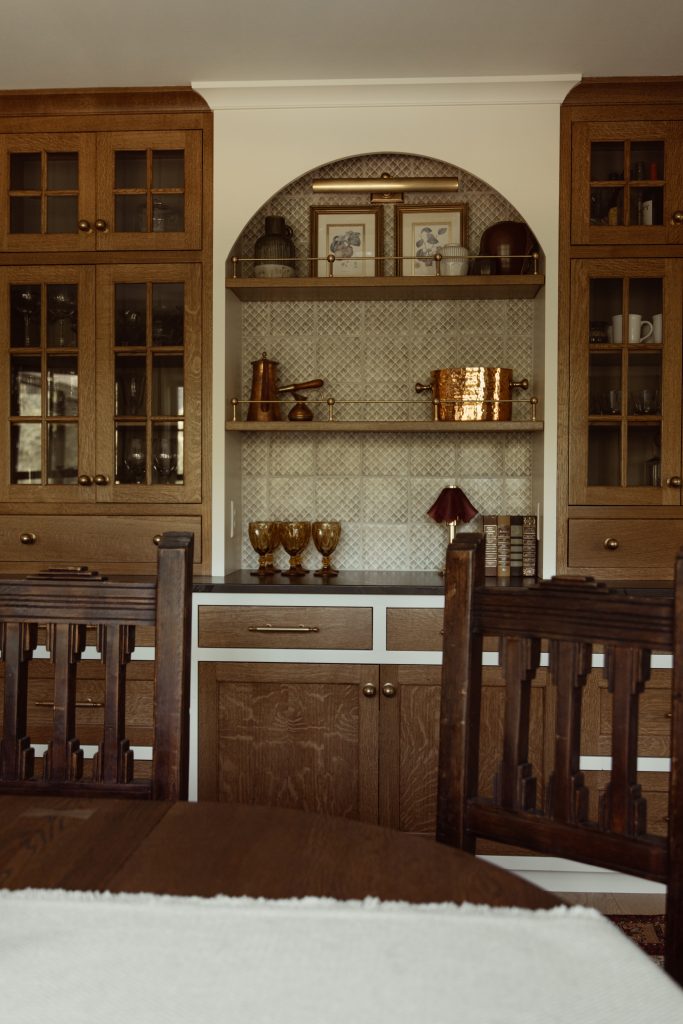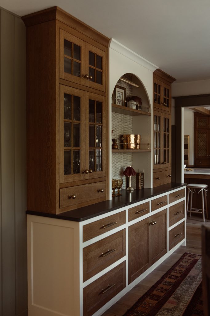 A custom arched bar steals the spotlight in this main-level remodel. Painted and oak cabinetry, hand-painted terracotta tile, and beautiful brass hardware create a timeless, yet playful vignette—made even more special by cherished heirloom glassware and open shelving to showcase it all.