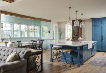 Nothing makes a house stand out on a sedate street like a front door painted in a bright color. This Kenwood home makes a statement with its classic brick stoop punctuated by a golden ray of sunshine. Technically, that’s the door painted with Benjamin Moore Dorset Gold HC-8, says Minneapolis interior designer Kate Roos. She also chose the Urban Electric Co. lantern above. Of course, this scene’s special je ne se quoi comes from the sisters who live here: Vivian, 6, and Helen, 9, add their own pop with popsicles that perfectly match their fuchsia dresses.