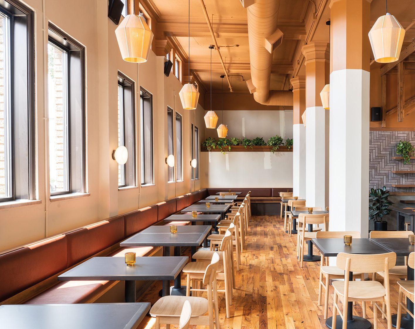 Many other design elements pay tribute to his family. A cinder-block centerpiece that resembles a hearth honors Vang’s father teaching him how to grill—a cooking method that inspired many dishes on the menu. Plants throughout recognize his mother’s green thumb, while a shelf toward the back is dedicated to family photos from the refugee camp. Vang says, “From the chairs and tables to the wall tiles, cinder blocks, and the food on the menu, everything here tells a story.”