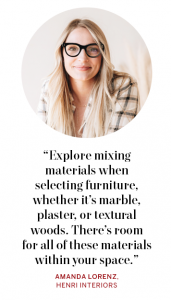 Amanda Lorenz, owner and principal designer of Henri Interiors, encourages readers to “explore mixing materials when selecting furniture, whether it’s marble, plaster, or textural woods. There’s room for all of these materials in your space. You can also layer textural fabrics when creating a neutral design scheme. Bouclés, shearlings, and textural linens are on an upswing. Don’t limit these fabric choices to pillows, but rather, be bold. Buy yourself a bouclé chair!”