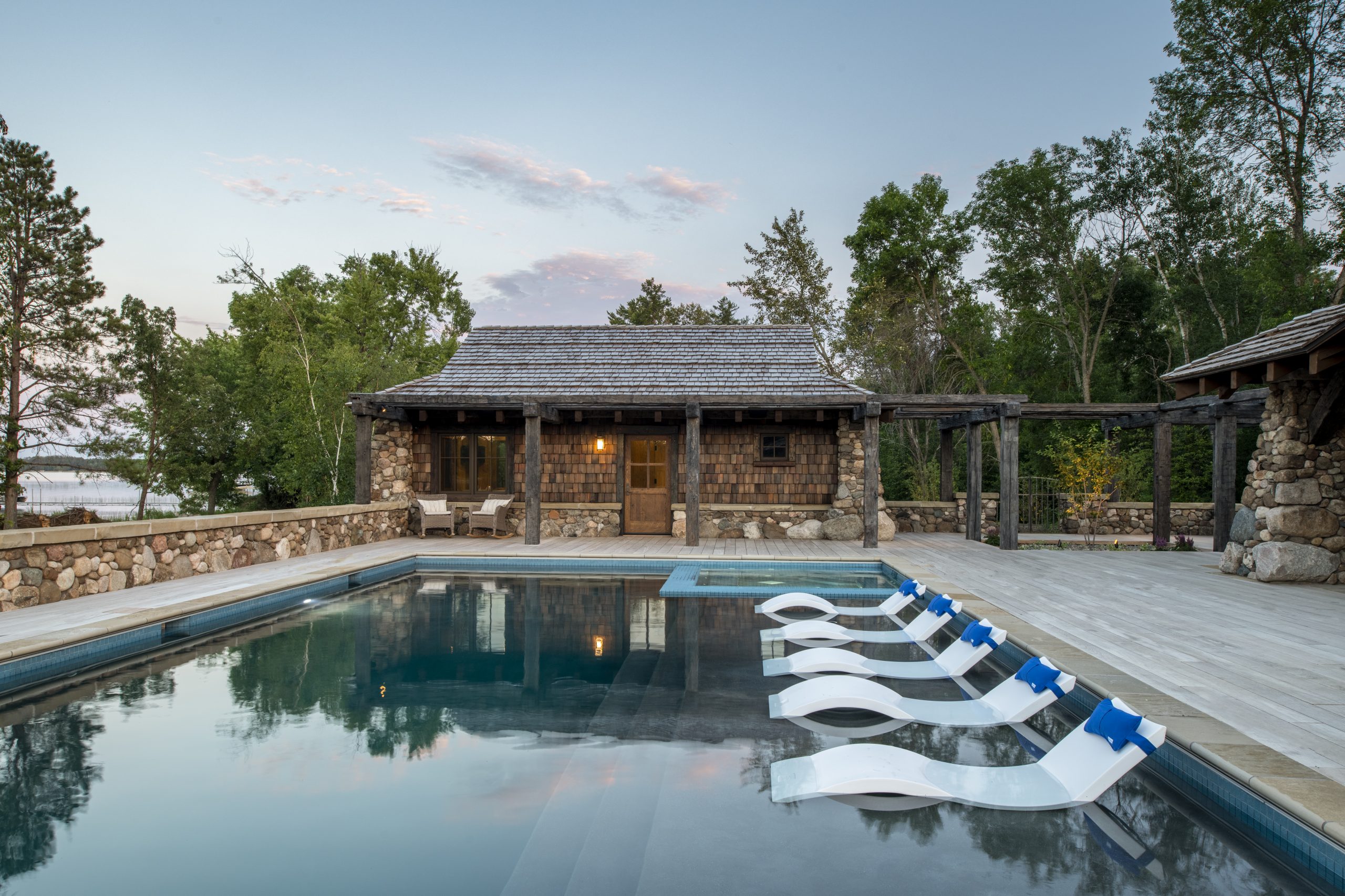 On Pelican Lake, this classic lodge by Nor-Son Custom Builders and Pearson Design Group looks like it has been there for decades. But its pool, cabana, and guest house were completed in 2022, with reclaimed barnwood, dry-stacked Minnesota fieldstone, and custom chestnut planks and shutters contributing to the rustic, aged look. The pool—tucked behind a stone ledge capped in limestone—boasts a black pearl smooth pebble finish with a hot tub and bathing ledge. With seamlessly integrated state-of-the-art technology, this retreat is as smart as it is timeless.