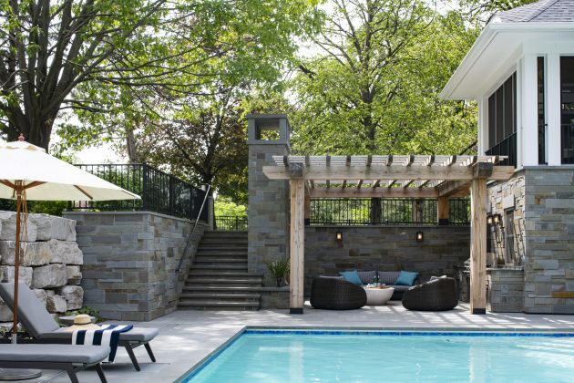This modern Minneapolis remodel transforms a corner-lot home into a secluded multigenerational oasis. Courtesy of TEA2 Architects, Santanni Custom Homes, and Aamir Khandwala Interior Design, the outdoor space is sunken into the site’s topography for privacy. A new three-season porch, open-air kitchen, and poolside dining table frame the bluestone pool deck—making the space feel like a private resort amid the urban surroundings.